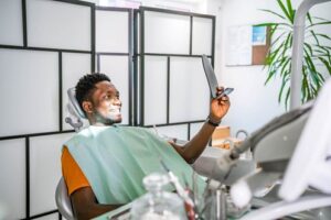 A patient at Twin Aspen Dental Center holds a mirror to look at his new dental work in Parker, CO.